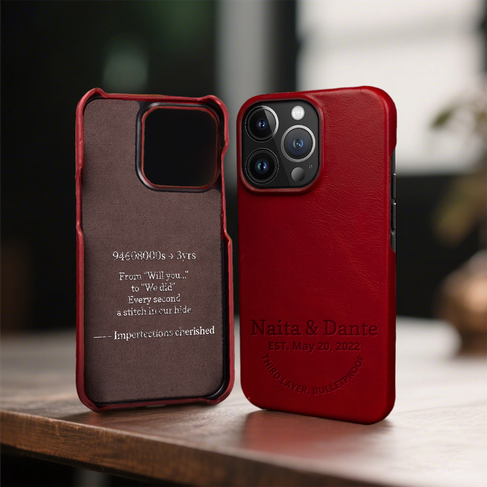 Celebrate your 3rd leather wedding anniversary with this luxurious handmade Full-Grain Leather iPhone Case, a timeless blend of craftsmanship, elegance, and sentimental value. Expertly crafted from premium top-grain cowhide leather, this semi-wrap case offers military-grade drop protection and anti-scratch coating, ensuring your device stays pristine. Compatible with iPhone 11-16 Pro Max models, it features precision-cut edgesanti-fingerprint matte finish, and a soft fabric-lined interior to prevent scratches.
